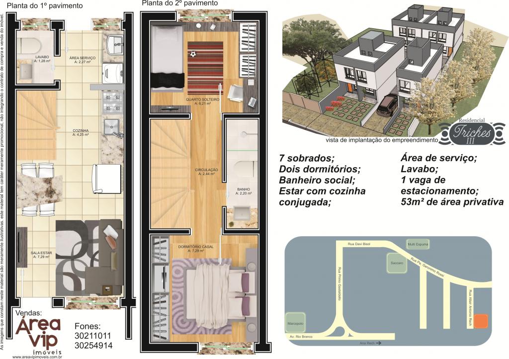 Com opções de 55,39m² e 68,33m², com até dois dormitórios e estacionamento próprio, os sobrados do empreendimento Triches 7º podem ser a opção ideal para você e sua família.
